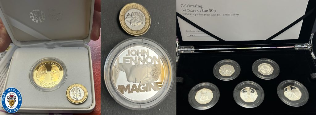 Police report three men aged 75, 79 and 84 were injured and were not seriously hurt. A large quantity of collectible gold and silver coins was stolen, mainly boxed Royal Mint coins in presentation boxes with proof of authenticity.
